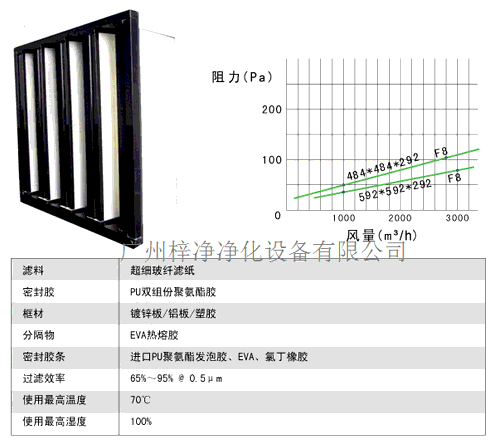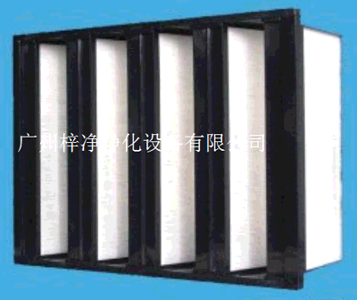 濾料超細(xì)聚丙烯纖維,呈V型排列在一個非常緊密的聚苯烯或鋁合金的支撐外框內(nèi);