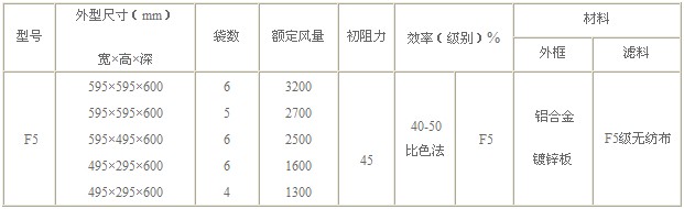 F5級袋式中效過濾器型號尺寸及其它參數