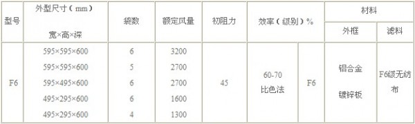F6級袋式中效過濾器標準技術參數: