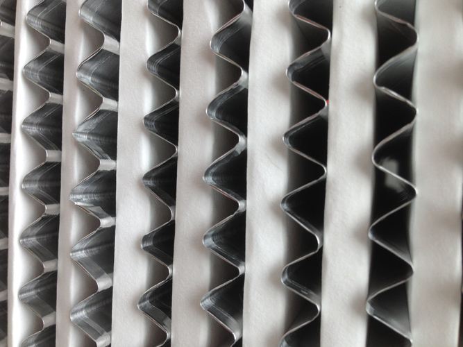 高溫高效過(guò)濾器濾材兩面180度翻折,形成鍥形褶層。高溫高效過(guò)濾器濾料折彎時(shí)有兩道壓痕,使其在隔板的尾端處形成鍥形盒式摺層,鍥形盒式褶層可以防止濾料破損。有些高溫高效過(guò)濾器生產(chǎn)商采用了單壓痕或滾痕式濾料褶層,甚至簡(jiǎn)單地人工折紙,在這種惰況下,濾料很容易被波紋形隔板尖銳的折頂損壞。或在過(guò)多搬運(yùn)過(guò)程中損壞濾紙。